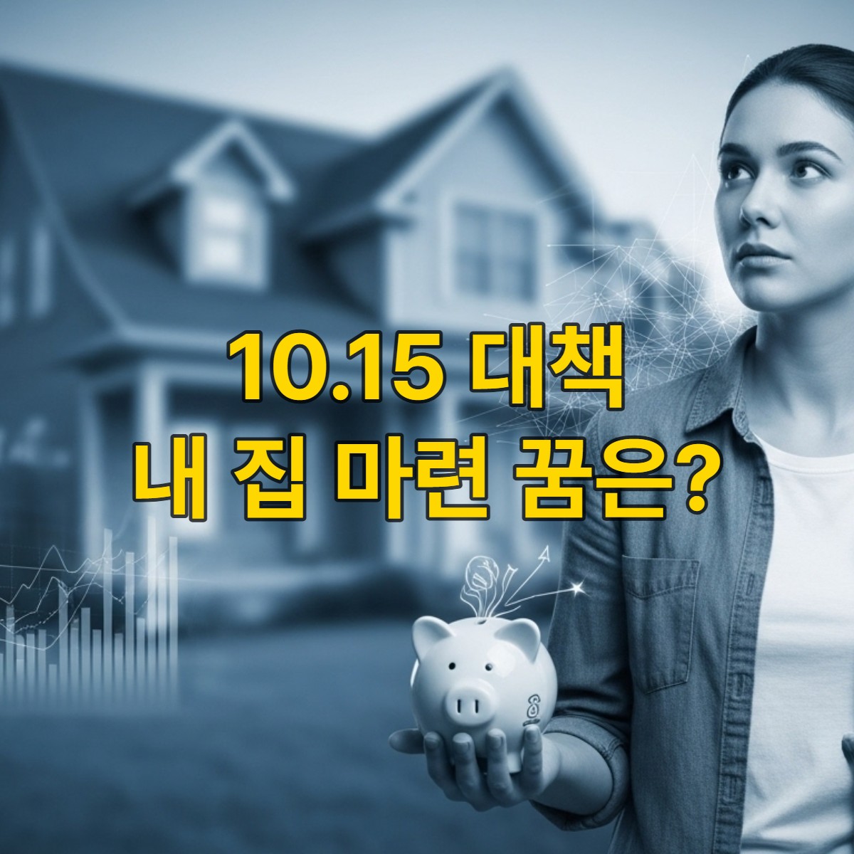 강화된 2025년 10.15 부동산 대책으로 내 집 마련 꿈이 멀어진 듯한 주택 시장 풍경을 배경으로, 고민하는 사람의 모습과 금융 규제를 상징하는 시각적 장벽이 어우러진 이미지.