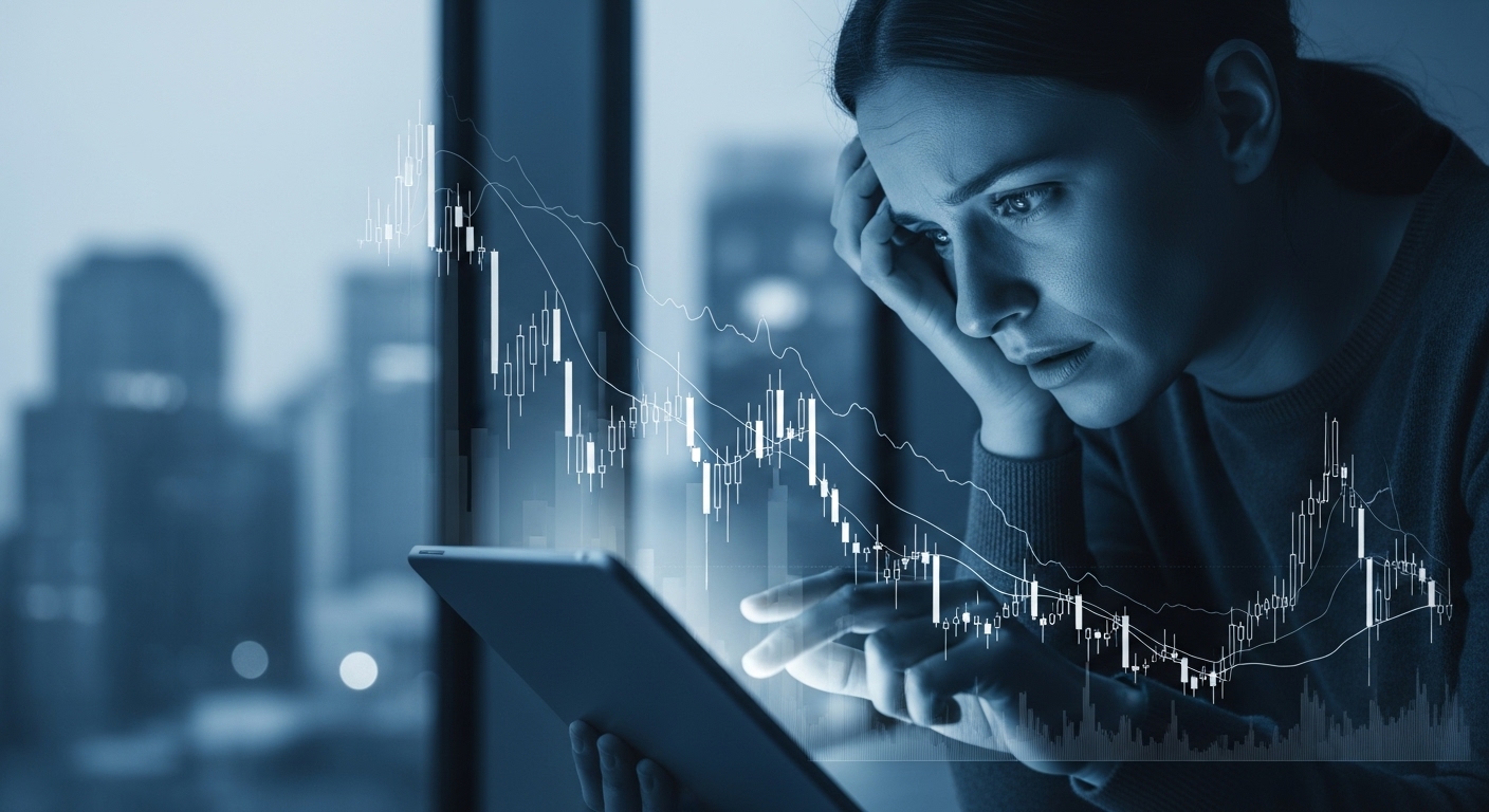 하향 곡선을 그리는 부동산 그래프를 보며 걱정하는 사람의 모습, 복잡한 시장 상황을 나타냄.